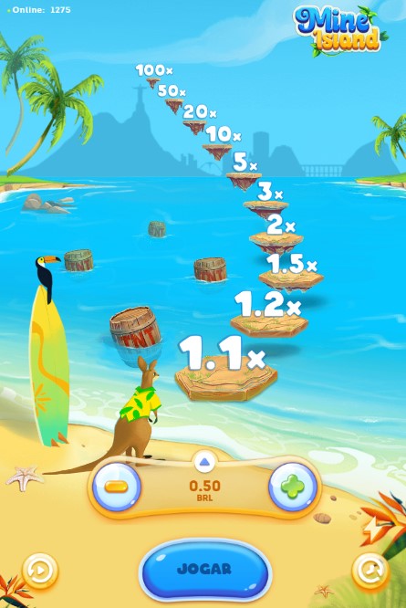 Mine Island é um jogo de crash ambientado em uma praia paradisíaca no rio de janeiro, brasil, onde você deve levar um canguru a pular pelos degraus até chegar no ponto mais alto, mas cuidado para o canguru não acabar pulando direto na água. Você sai ganhando ao coletar seus ganhos antes do canguru cair.
