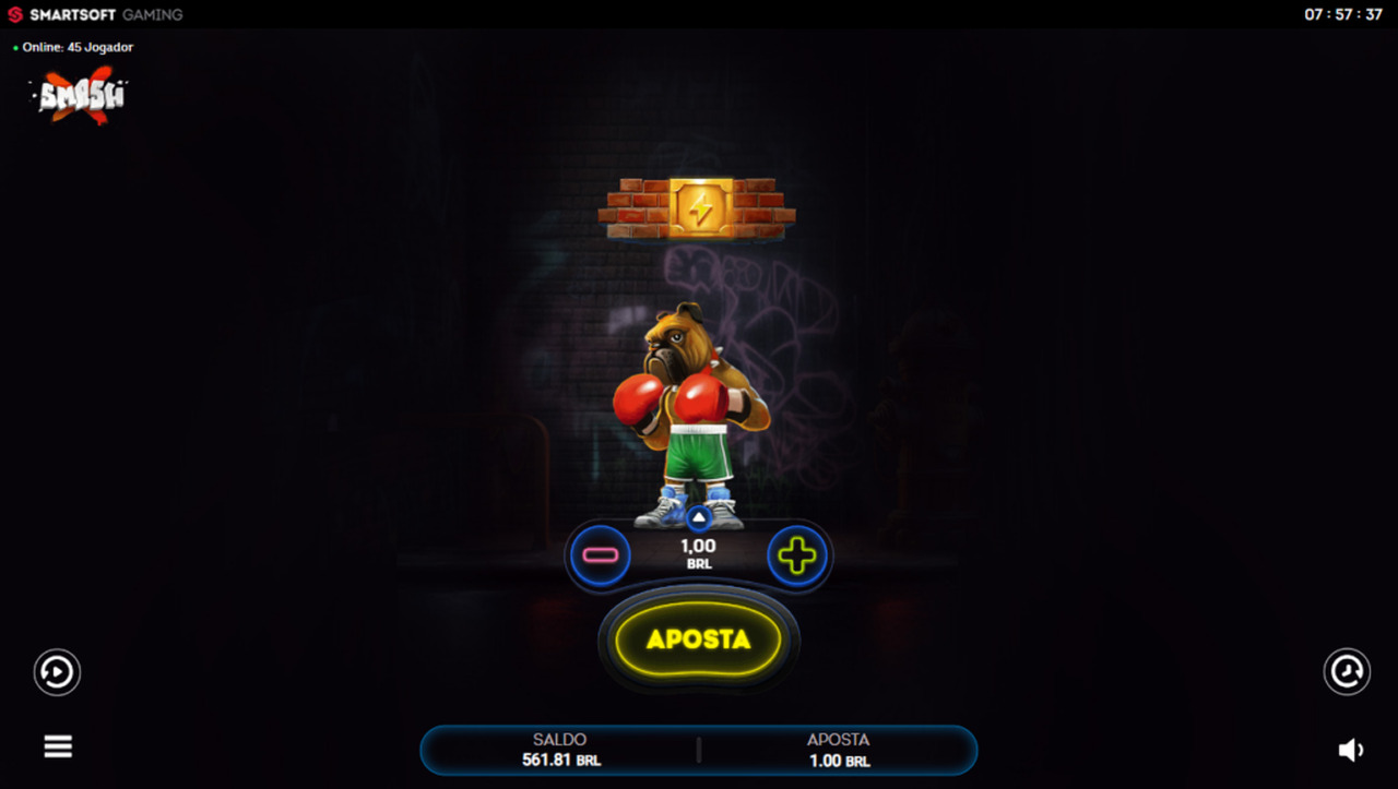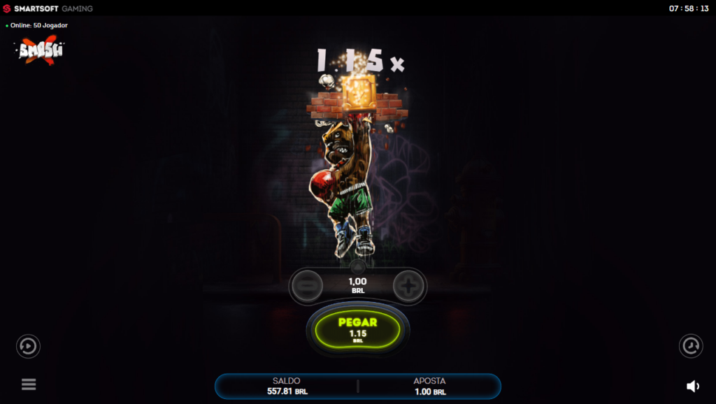 Para jogar SmashX no nosso cassino, faça uma aposta e inicie a rodada. O bulldog boxeador atinge blocos para aumentar o multiplicador. Você deve decidir quando parar para garantir os ganhos antes que o bulldog pare de bater, para isso você deve clicar no botão escrito PEGAR pra realizar o saque.