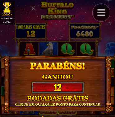 As Rodadas Grátis do jogo do búfalo são acionadas ao descobrir 4 ou mais símbolos scatter no jogo base, concedendo 12 giros grátis imediatamente. Ao descobrir 5 deles, você ganha 17 e 6 scatters que garantem 22 Rodadas Grátis.