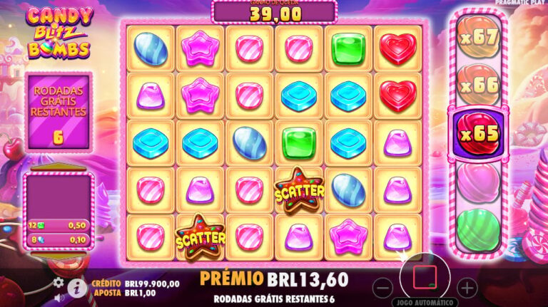 Ao revelar no mínimo 4 scatter nas bobinas, você aciona as rodadas grátis do jogo Candy Blitz Bombs.