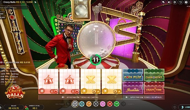 Crazy Balls é uma mistura de bingo com elementos clássicos do jogo Crazy Time, o qual você deve apostar em cartelas ou rodadas bônus e completar as linhas para vencer.