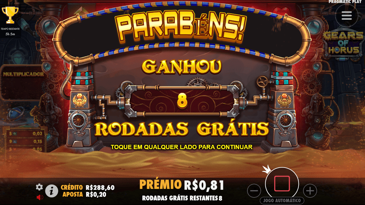 O valor mínimo de aposta no jogo Gears of Horus é de R$0,20.