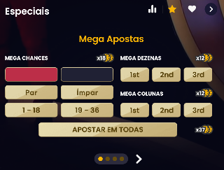 Assim como em outros jogos de roleta, Mega Roulette oferece a opção de apostas especiais, que incluem padrões de apostas populares entre aficionados pela roleta. Elas cobrem um número determinado de casas da roleta, pelo valor unitário para cada aposta. Por exemplo, se sua aposta for R$0,50 e apostar na MEGA DEZENAS, sua aposta total será de R$6,00.