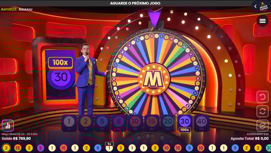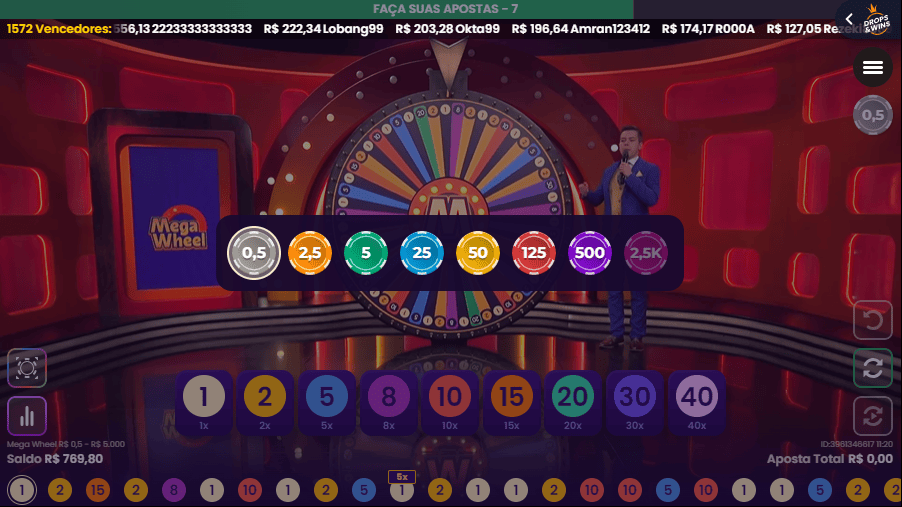 Mega Wheel é um jogo de cassino ao vivo com um apresentador, que conta com uma roda da fortuna que inclui números. Além de ter um multiplicador para deixar tudo ainda mais emocionante.