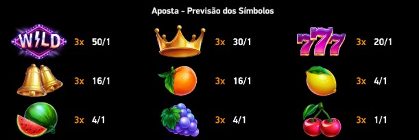 - Wild: Substitui todos os símbolos da tabela de pagamento, com exceção dos especiais.