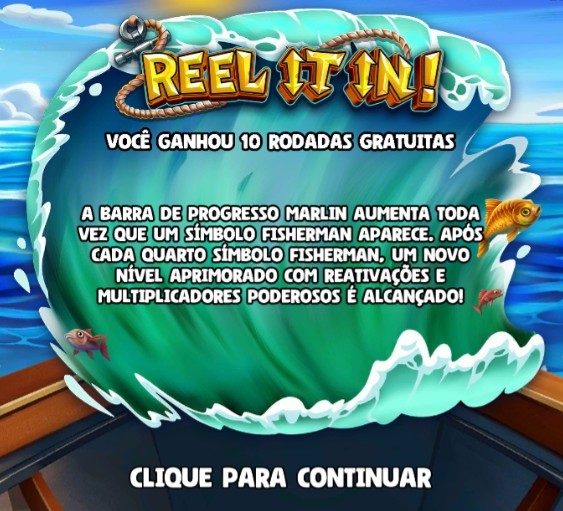 Com 5 scatters, você ativa 10 giros onde todos os peixes têm valores de pelo menos 5x, e sempre aparece pelo menos 1 peixe e 1 Pescador por rodada.