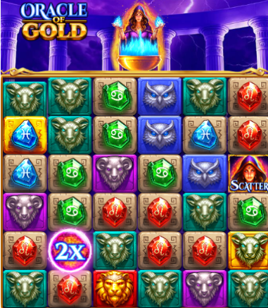 No slot Oracle of Gold, produzido pela Pragmatic Play, o tema é inspirado nas sabedorias do Oráculo, capaz de revelar cenários do futuro. Com grade 6×6, ele utiliza a mecânica de cascata de repor símbolos na grade para dar dinâmica aos giros.