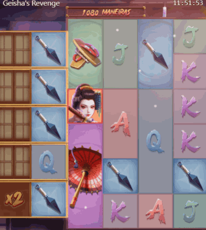 Em Geisha’s Revenge, você visita o Japão feudal ao lado da personagem Ayane, uma geisha que busca vingança. A grade é composta por 5 bobinas e linhas que variam entre 5 e 6, com até 6480 formas de ganhar.