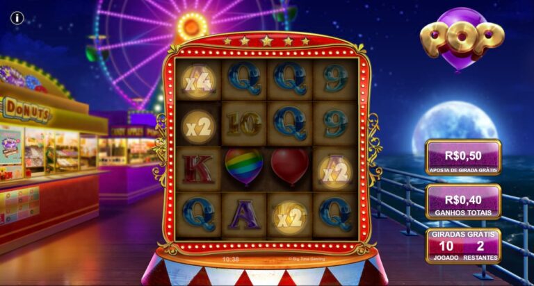 Pop é um jogo de slot ambientado no famoso pier de Santa Mônica, com balões coloridos como tema principal em meio as barraquinhas de um parque de diversão com muito entretenimento a cada giro. O jogo utiliza uma grade de 4 bobinas e 4 linhas com 256 maneiras de ganhar. Você ganha ao revelar no mínimo 2 símbolos iguais nas bobinas.