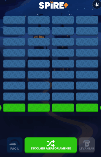 O jogo Spire+ tem uma interface simples, com uma noite estrelada e um castelo ao fundo. A grade é composta por quadrados azuis, que ficam verdes quando a rodada começa e disponíveis para serem escolhidos.