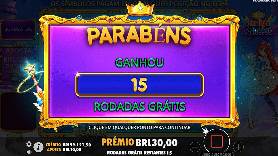 Consiga 4x o símbolo scatter e ganhe 15 rodadas grátis. O grande diferencial nas rodadas grátis de Starlight Princess é o multiplicador cumulativo.