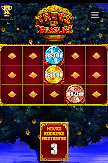 O valor mínimo de aposta no jogo Trees of Treasures é de R$0,20.
