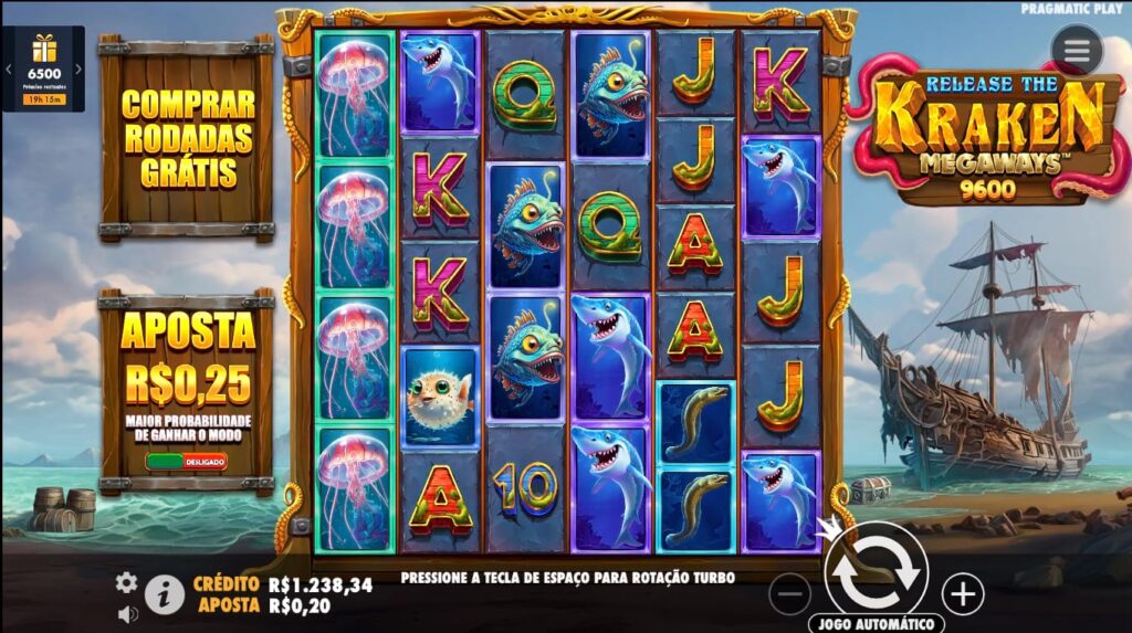 Veja abaixo um exemplo de tela de um jogo de slot com mecânica Megaways, o Release the Kraken Megaways.