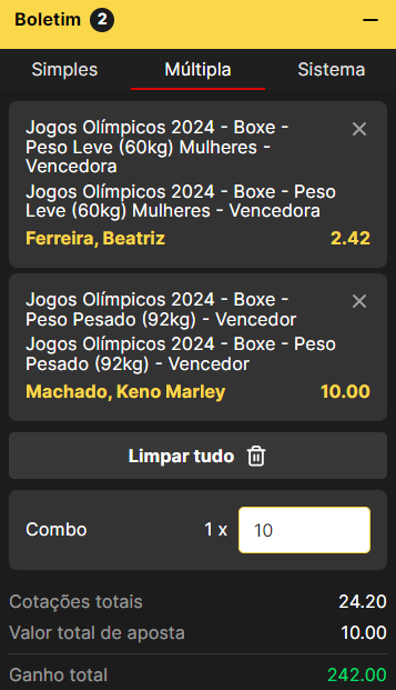 Apostar nos atletas do Brasil não só aumenta a emoção, mas também oferece a oportunidade de torcer pelo país e apoiar seus campeões. Com uma aposta de R$10, o ganho potencial é de R$242.