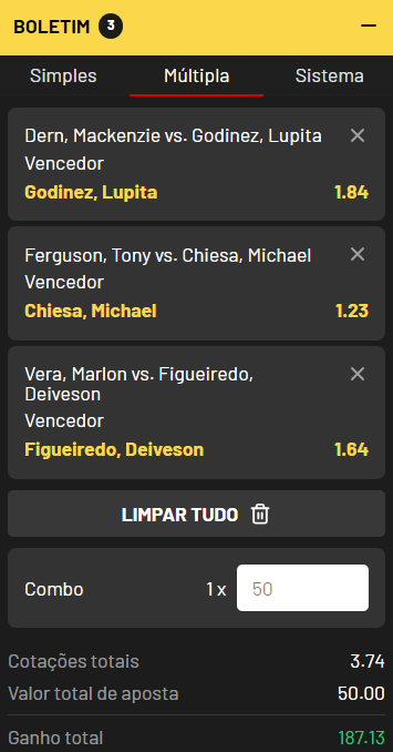 A imagem abaixo mostra um exemplo de aposta personalizada no MMA, mais especificamente no UFC. Nessa aposta múltipla, foram selecionados três combates diferentes. As odds para cada vencedor foram combinadas, aumentando o potencial de ganho total. Aposte em múltiplas lutas para maximizar suas chances de sucesso e obter maiores retornos.