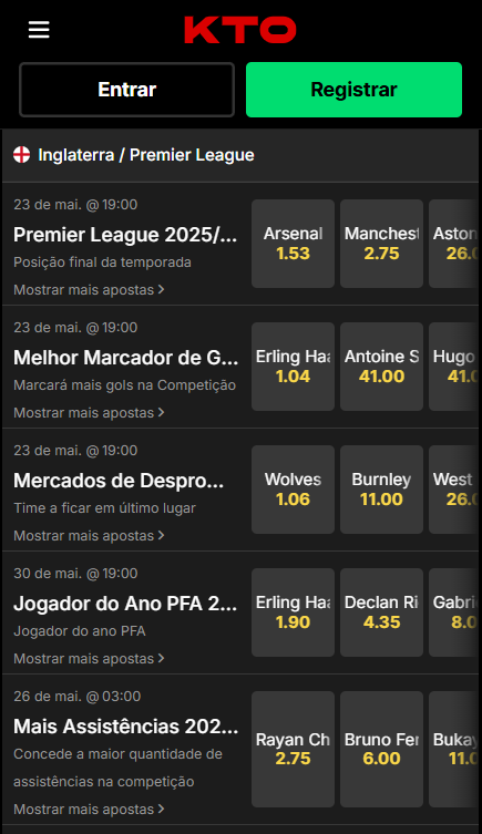 Imagine que, antes do final da temporada da Premier League 2025/26, o Arsenal aparece com odds de 1.53 para terminar como campeão. Ao apostar R$100 nesse palpite, o retorno potencial seria de R$153 caso o time conquiste o título.