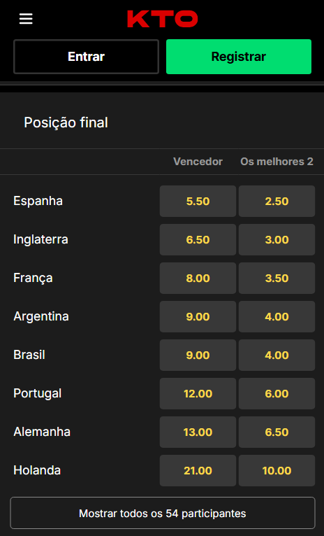 A KTO se destaca como uma das melhores plataformas para quem deseja fazer uma aposta no campeão da Copa do Mundo, principalmente por oferecer odds competitivas mesmo para seleções favoritas.