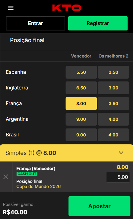 Apostas para o campeão da Copa 2026 já estão disponíveis na KTO, que oferece odds competitivas mesmo para seleções favoritas