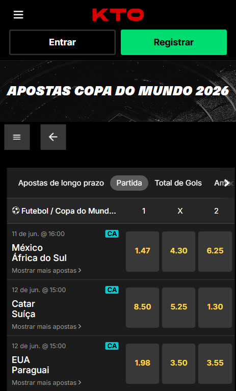 A KTO se destaca como uma das melhores opções para quem busca onde apostar na Copa do Mundo. A plataforma é autorizada, oferece uma ampla variedade de mercados de futebol e já disponibiliza apostas de longo prazo com ótimas odds.
