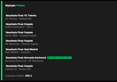 Mais uma aposta de R$10, com uma múltipla com 7 seleções, apostando em resultado final em jogos do Mundial e de diversos outros campeonatos. Confira: