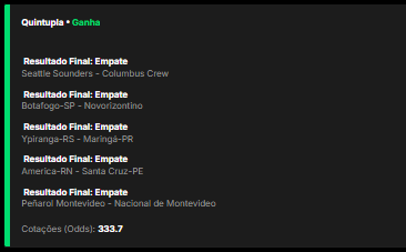 Com uma aposta de R$5, nosso craque montou uma múltipla de 5 seleções, apostando em resultado final em jogos da Série B, Série C, Série D, da MLS e do campeonato uruguaio. O resultado? Empate em todos os jogos. Se liga na mitada: