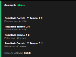 Com uma aposta de R$5, o apostador montou a odd mais alta da semana (650) e simplesmente mitou! Cravar o placar do jogo já é difícil, agora cravar o resultado do 1º tempo e do jogo… aí é demais! Confira essa mitada abaixo: