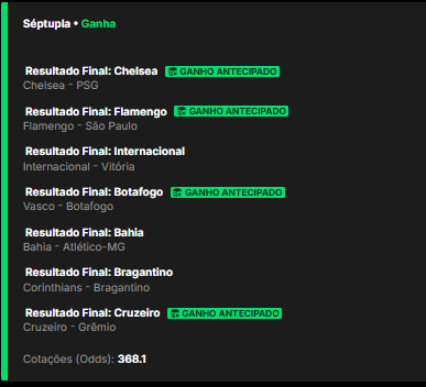 Com uma aposta de R$5, nosso craque montou uma múltipla de 7 seleções, apostando em resultado final em jogos da Série A e do mundial de clubes. O resultado? Uma mitada impressionante:
