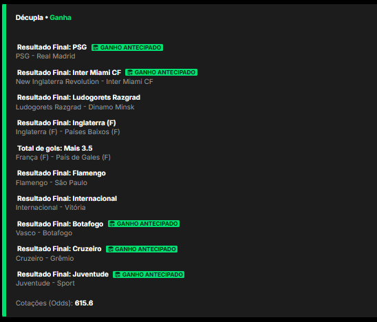 Com uma aposta de R$5, o apostador montou a odd mais alta da semana (615) e simplesmente mitou! Teve jogo do mundial de clubes, MLS e Campeonato Brasileiro, além de diversos outros campeonatos! Confira detalhadamente abaixo: