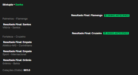 Com uma aposta de R$15, o apostador montou uma múltipla ousada com 6 seleções e odds totais de 901,02. Os jogos? Só cravada de resultado no Brasileirão Série A, com seis jogos e seis resutlados finais certos. Veja: