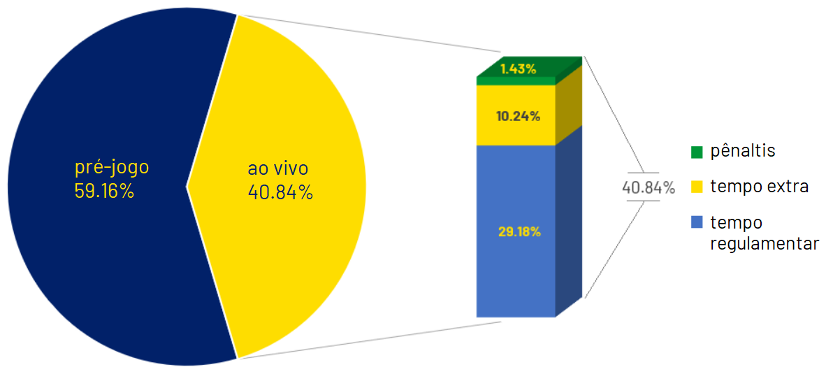 - Apostas do dia do jogo tem uma parcela dominante, com apostas ao vivo tendo parcelas maiores nos jogos mais importantes.
