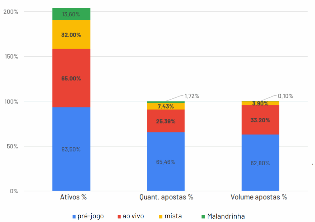 As apostas ao vivo também capturaram uma fatia considerável da atividade, com 65% dos apostadores participando dessa modalidade. Isso permite adicionar ou modificar apostas em resposta aos eventos do jogo em tempo real.