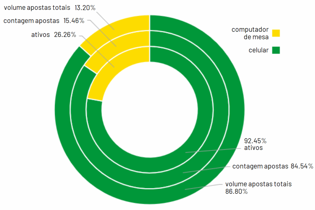 No que diz respeito à distribuição das apostas, 84,54% das contagens de apostas e 86,80% dos valores apostados vieram de dispositivos móveis, confirmando a predominância do celular como meio favorito para apostas na KTO.