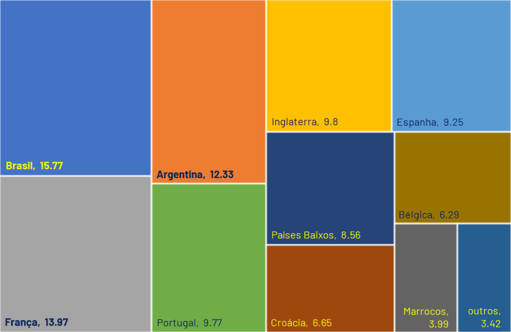 Ao todo, 96,58% das apostas na Copa do Mundo envolveram as 10 seleções acima. Eles também geraram pouco menos da metade de todas as apostas (48,3%) colocadas antes e durante a campanha.