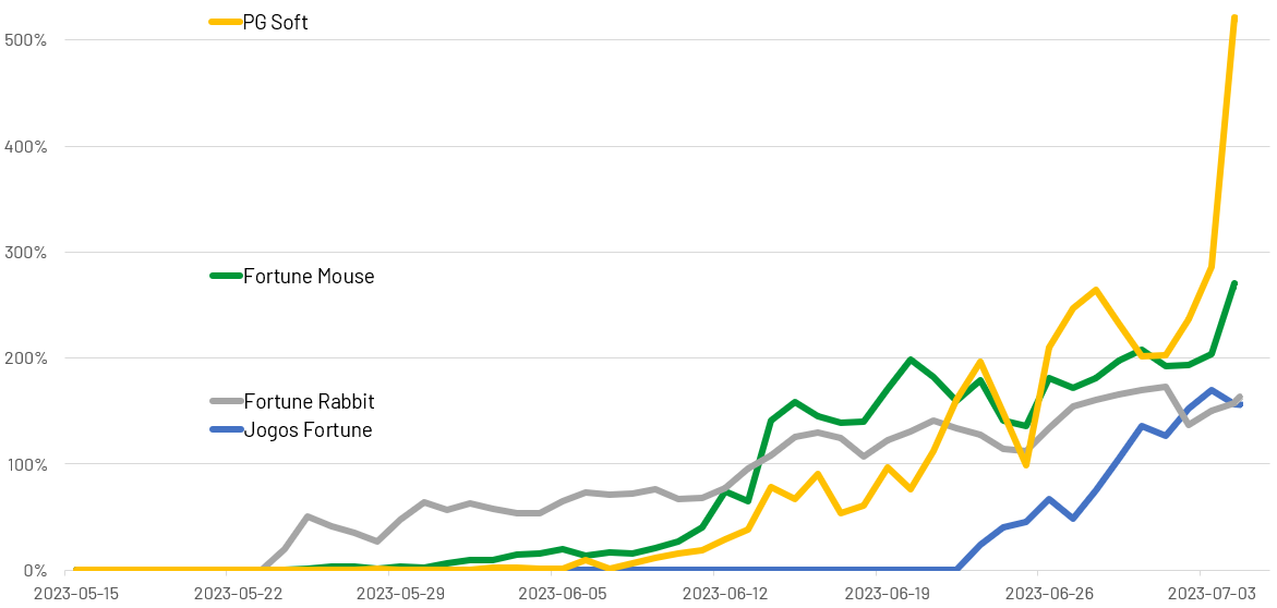 Este breve estudo, porém abrangente, baseia-se em grandes volumes de dados agregados dos meses de maio e junho de 2023, enriquecido por indicadores e abordagens de Business Intelligence (BI) de topo. Também validamos nossas descobertas por meio de outras perspectivas fornecidas pela tração on-line de algumas das páginas de jogos que mais crescem (conforme registrado pelo Google Search Console), bem como pela demanda de pesquisa pública rastreada pelo Google Trends.
