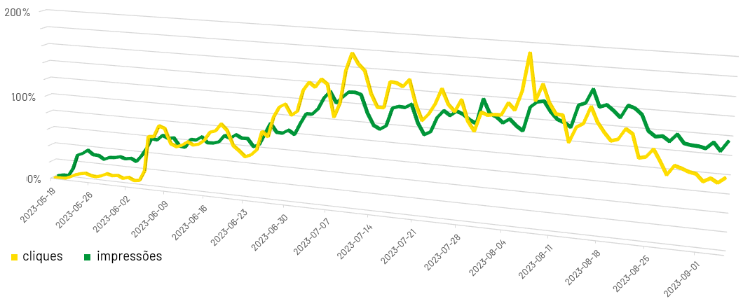 Desde meados de maio, quando o Fortune Tiger foi lançado no KTO, a página do jogo tem registrado um aumento consistente e constante, com picos notáveis, conforme ilustrado abaixo (em termos de volumes ponderados de cliques e impressões provenientes da pesquisa orgânica).