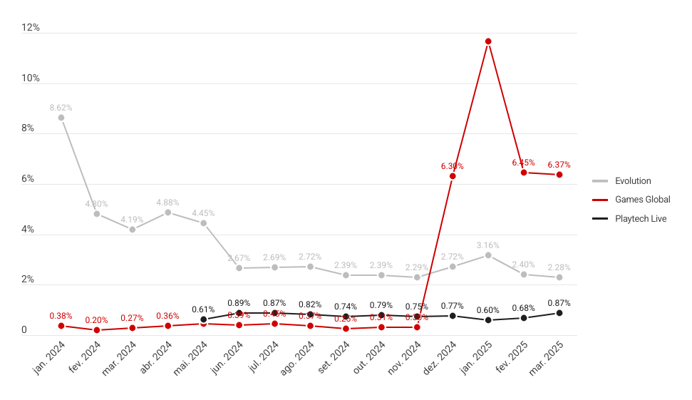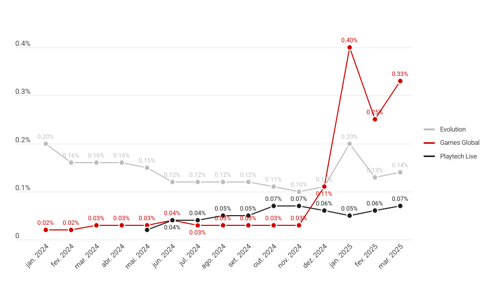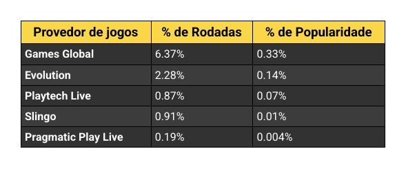Classificados pela parcela de rodadas que seus jogos geraram ao longo do último ano, a Games Global liderou com 0.33% de todas as rodadas, quase o triplo da participação da Evolution, que ficou em segundo lugar com 0.14%. Na sequência, aparecem Playtech Live (0.07%), Slingo (0.01%) e Pragmatic Play Live (0.004%), com presenças mais discretas, mas ainda relevantes.