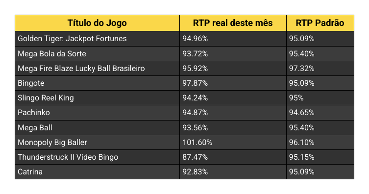 Neste mês, o Immortal Romance Video Bingo se destacou com uma RTP de 107.61% – quase 13% a mais que a RTP padrão (95.13%). Isso significa que, para cada R$100 apostados, os jogadores receberam em média R$107,61 de volta.