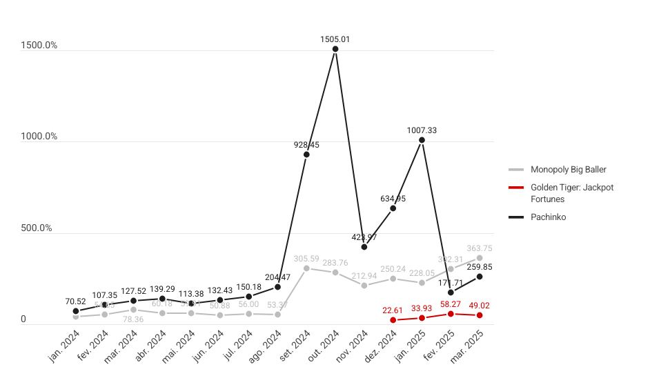 O destaque vai para Pachinko, que registrou um crescimento acentuado no final de 2024 — um salto de quase 636% entre agosto e outubro, quando atingiu seu pico com 1.505.01 rodadas diárias por jogador. Foi o maior valor registrado no período.