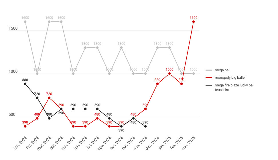 O Mega Ball lidera com folga. Mesmo com oscilações, manteve uma média sólida em 2024 e começou 2025 com fôlego: acumulando mais de 18 mil buscas ao longo do período analisado. Já o Monopoly Big Baller surpreendeu. Em março de 2025, alcançou 1600 buscas, seu maior pico até hoje — um crescimento de mais de 300% desde o início de 2024.