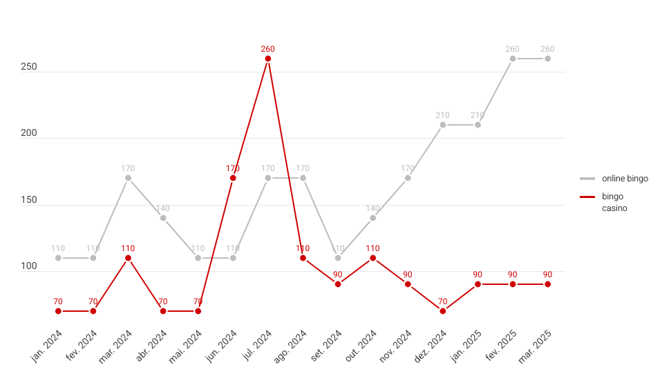 O termo “bingo online” mostrou um crescimento consistente e sustentável. Em janeiro de 2024, registrava 110 buscas mensais. Já em março de 2025, chegou a 260 — um salto de 136% no período.