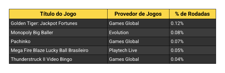 Outros jogos, como Monopoly Big Baller e Pachinko, aparecem com destaque no número de rodadas, sustentando um público fiel e ativo, mesmo fora do top 5 em popularidade. O oposto acontece com Mega Bola da Sorte e Mega Ball, que seguem entre os mais populares, mas registram poucas rodadas por sessão.