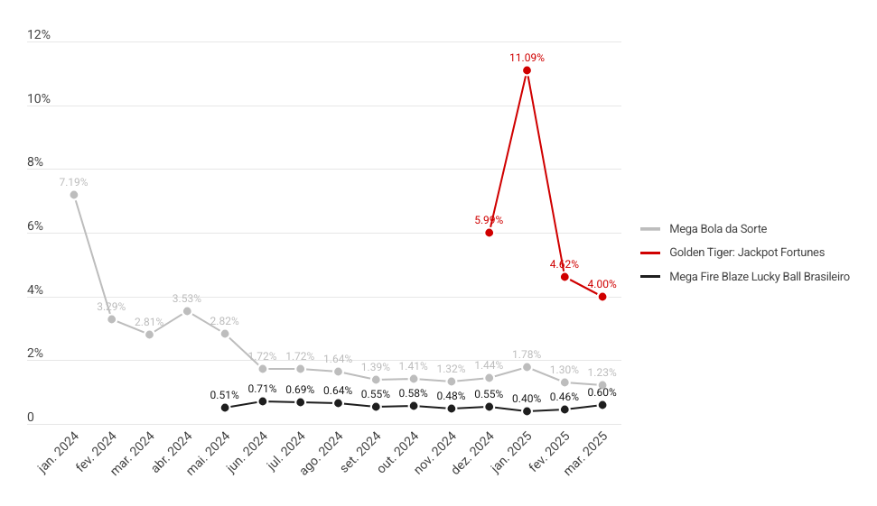 O Mega Fire Blaze Lucky Ball Brasileiro, por sua vez, mostrou tendência de queda ao longo dos meses. Ainda assim, sua média mensal de 562 o coloca entre os jogos mais relevantes do período.