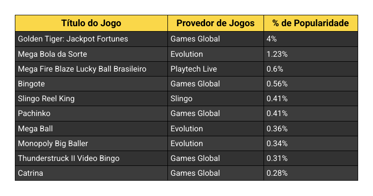 Entre os cinco primeiros, apenas o Golden Tiger: Jackpot Fortunes ocupa a mesma posição (1º lugar) nos dois rankings: popularidade e volume de jogo.