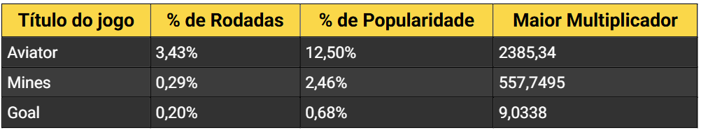 Aviator manteve a liderança, mesmo com leve queda na popularidade (de 12,67% para 12,50%) e nas rodadas jogadas.