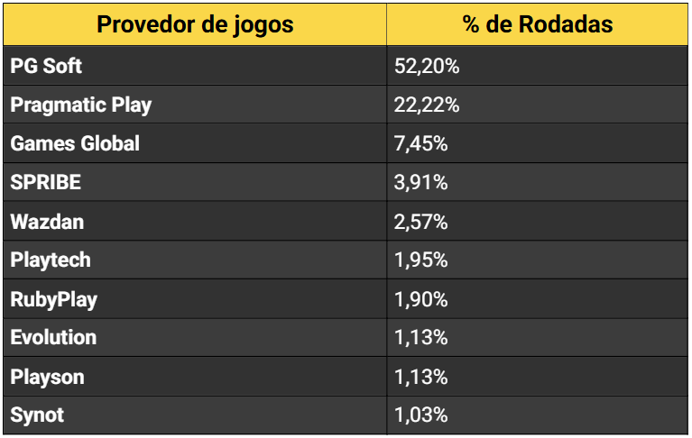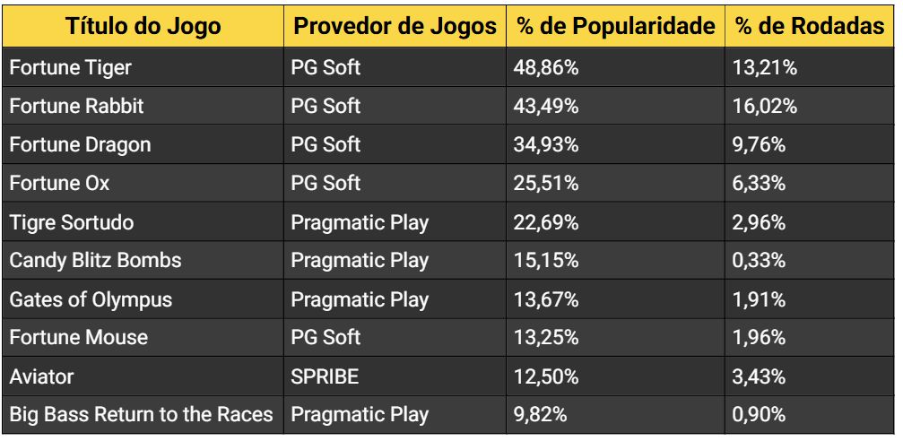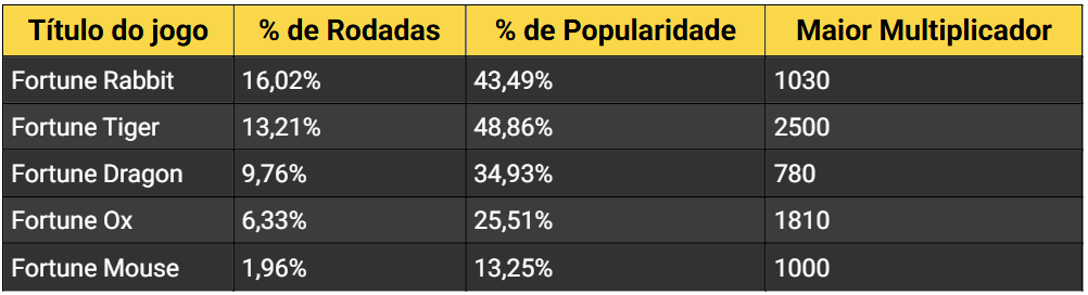 Fortune Rabbit manteve o segundo lugar com 43,49%, e continua sendo o jogo com o maior volume de rodadas (16,02%).
