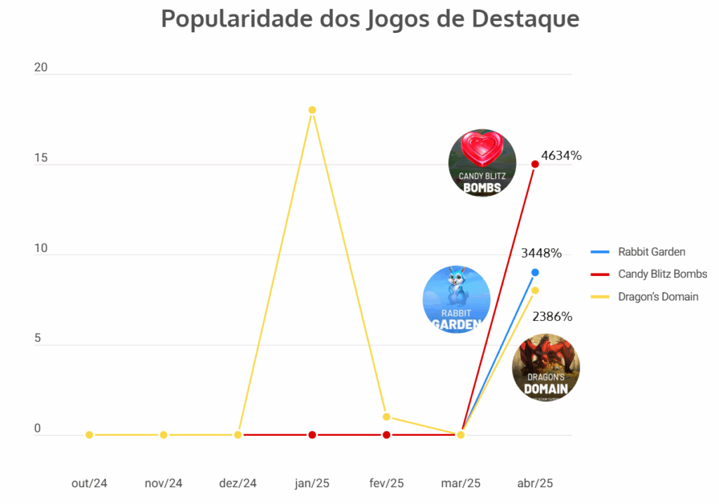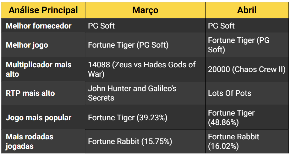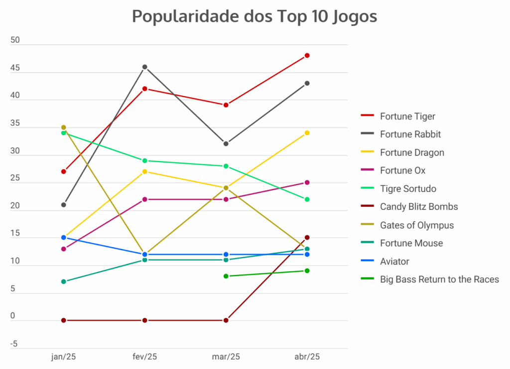 Em abril, Rabbit Garden, Candy Blitz Bombs, Fortune Mouse e Big Bass Return to the Races entraram no Top 10, substituindo Jeitinho Brasileiro, Hot Slot: 777 Crown, Ratinho Sortudo e O Vira-lata Caramelo, que estiveram entre os mais jogados em março.
