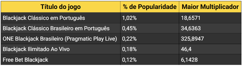 Blackjack Clássico Brasileiro em Português permaneceu estável em popularidade e teve novo avanço técnico, subindo de 20,92x para 34,64x.