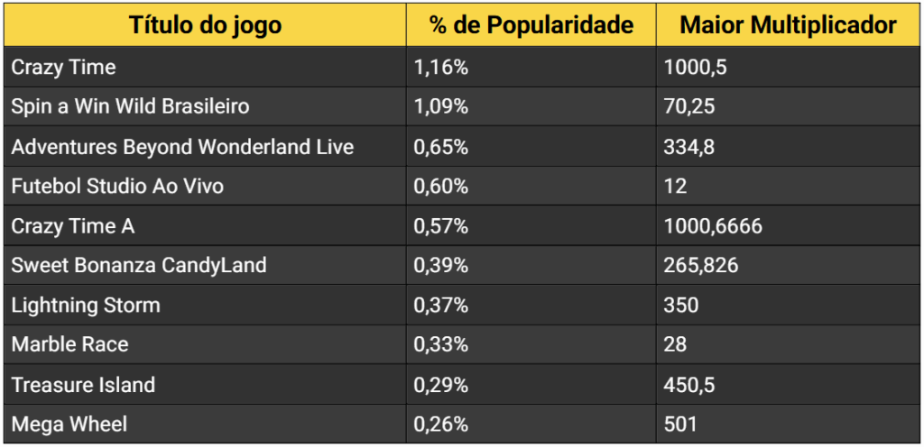 Crazy Time, por outro lado, teve leve oscilação negativa, caindo de 1,18% para 1,16%, mas surpreendeu positivamente com um novo pico de multiplicador: 1000,5x, bem acima dos 714,43x registrados em março.