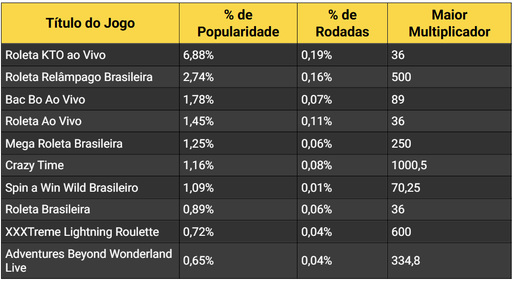 Roleta KTO ao Vivo, exclusiva da KTO, manteve a liderança com leve crescimento em abril, subindo de 6,65% para 6,88% em popularidade — consolidando-se como a principal mesa da plataforma.