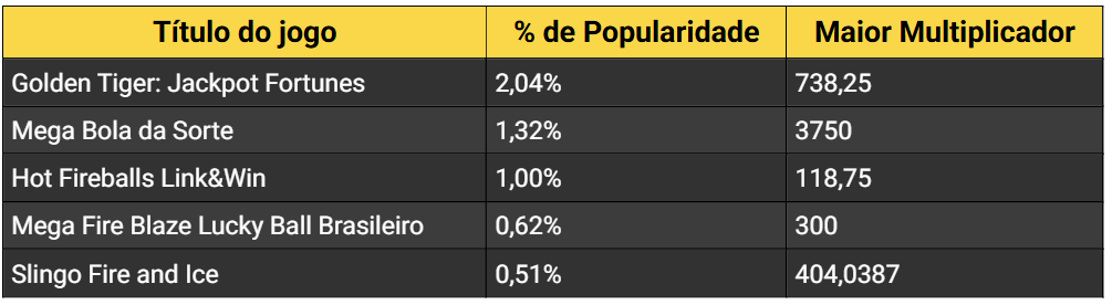 A novidade do mês foi Slingo Fire and Ice, que entrou no Top 5 com 0,51% de popularidade e multiplicador de 404,04x, ocupando o espaço antes preenchido por Bingote, que saiu do ranking.